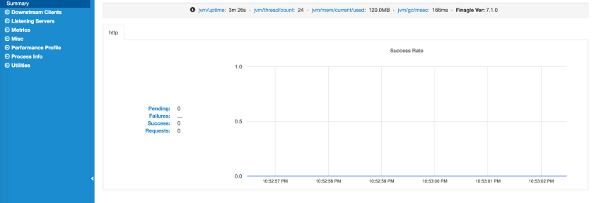 Every Finatra by default exposes an admin interface at http://localhost:9990/admin that you can use to get system level details like CPU usage profile, heap profile, server information, and many other. To learn about all admin features refer to Twitter Server documentation.