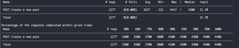 If you compare this result with the load test result with just POST request. You will see that we are able to serve two times the requests. Also, we can see the GET request is cheap compared to POST request. This is expected as GET can be cached so server has to do less work to return the results.