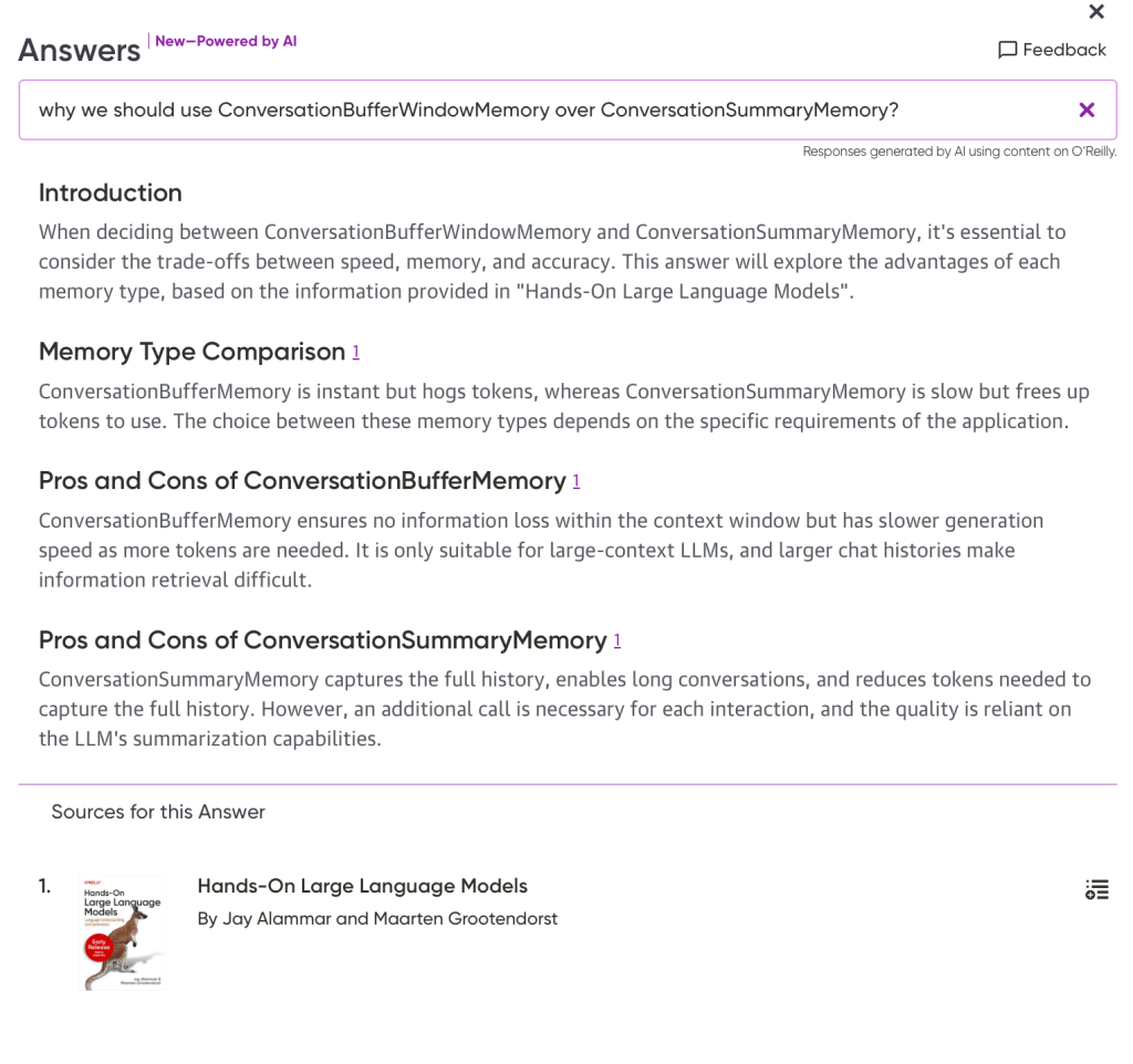 I asked another question list the different memory types in LLM applications where again it listed an incomplete answer from another book. [Building Generative AI-Powered Apps: A Hands-on Guide for Developers](https://learning.oreilly.com/library/view/-/9798868802058)