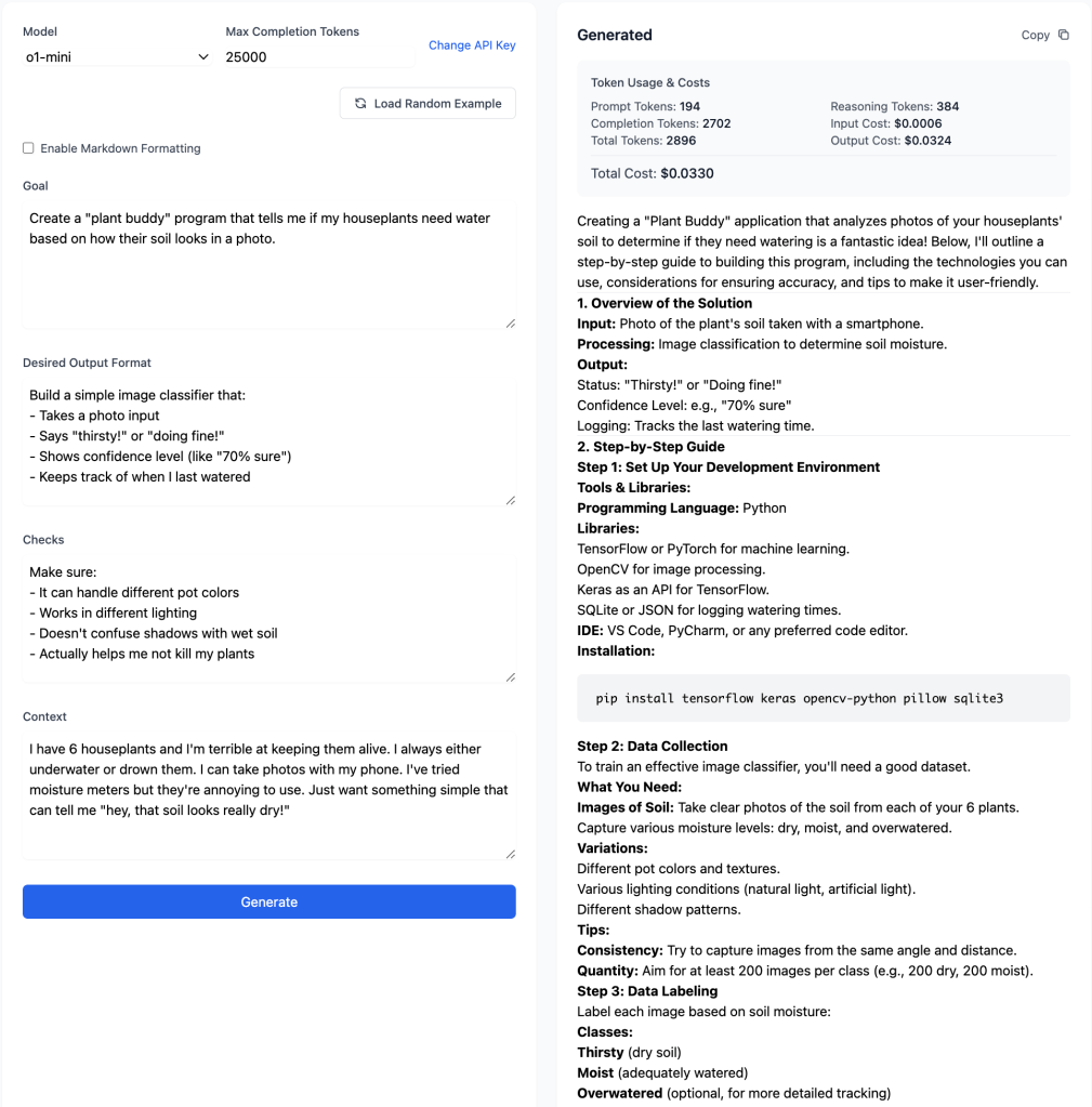 I created a web application using Claude that enforces this way of prompt building. You can access the application here: https://tools.o14.ai/o1-playground.html. It runs entirely client-side. You will be prompted first for your OpenAI API key, which will be stored in your browser’s local storage. Then, you can fill out the form and submit it to OpenAI. An example is shown below. You can view the complete response from the o1-mini model. here.