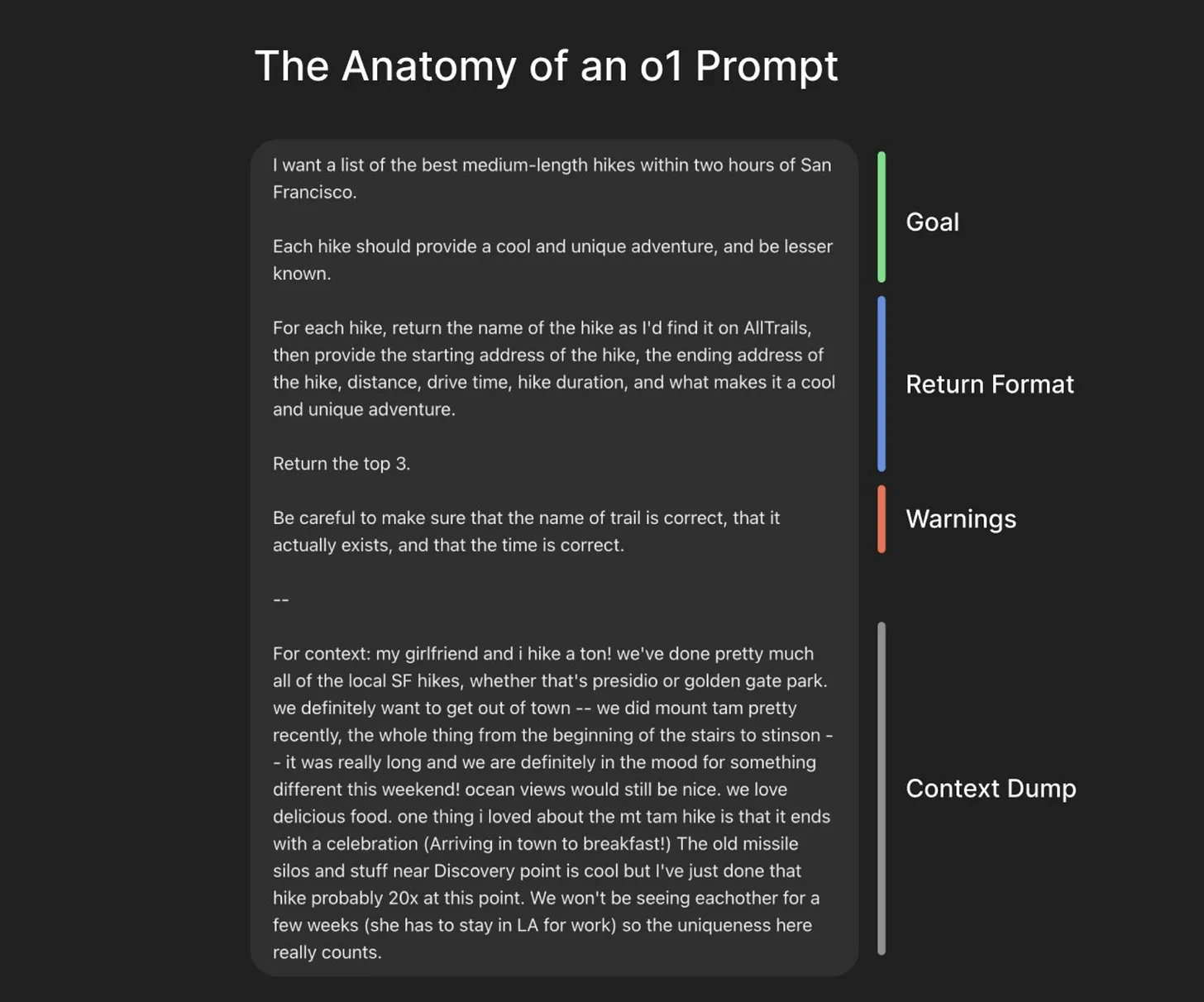 If you have used ChatGPT or Claude, you would have used them in an incremental, multi-turn conversation. This workflow does not work effectively with the o1 model. As Ben mentioned, with o1, you provide all the information in a single, one-shot input and let the model do its magic. He calls these inputs ‘briefs.’ He also shared an example of this approach.