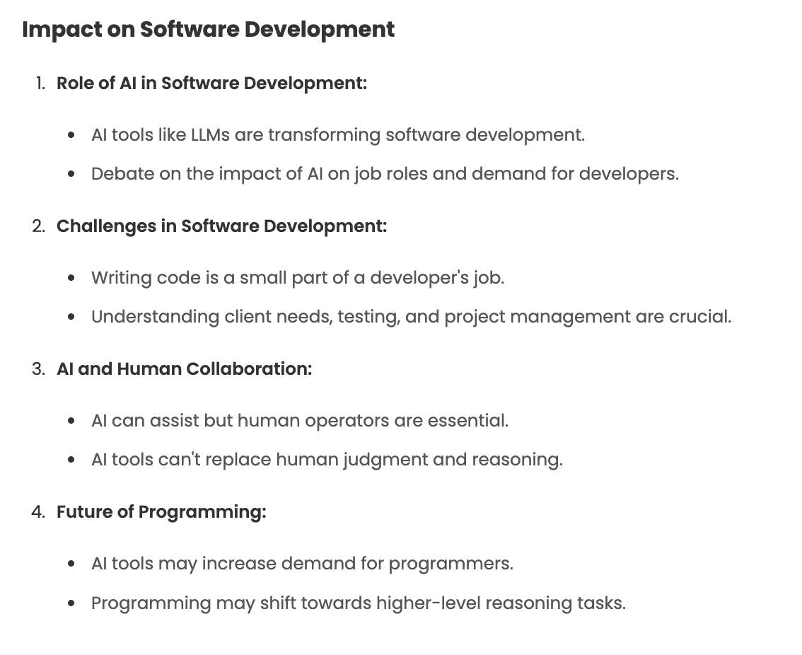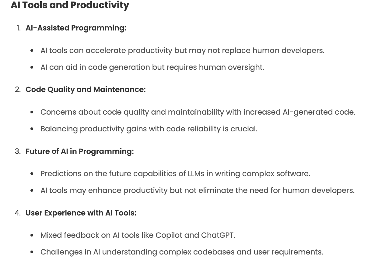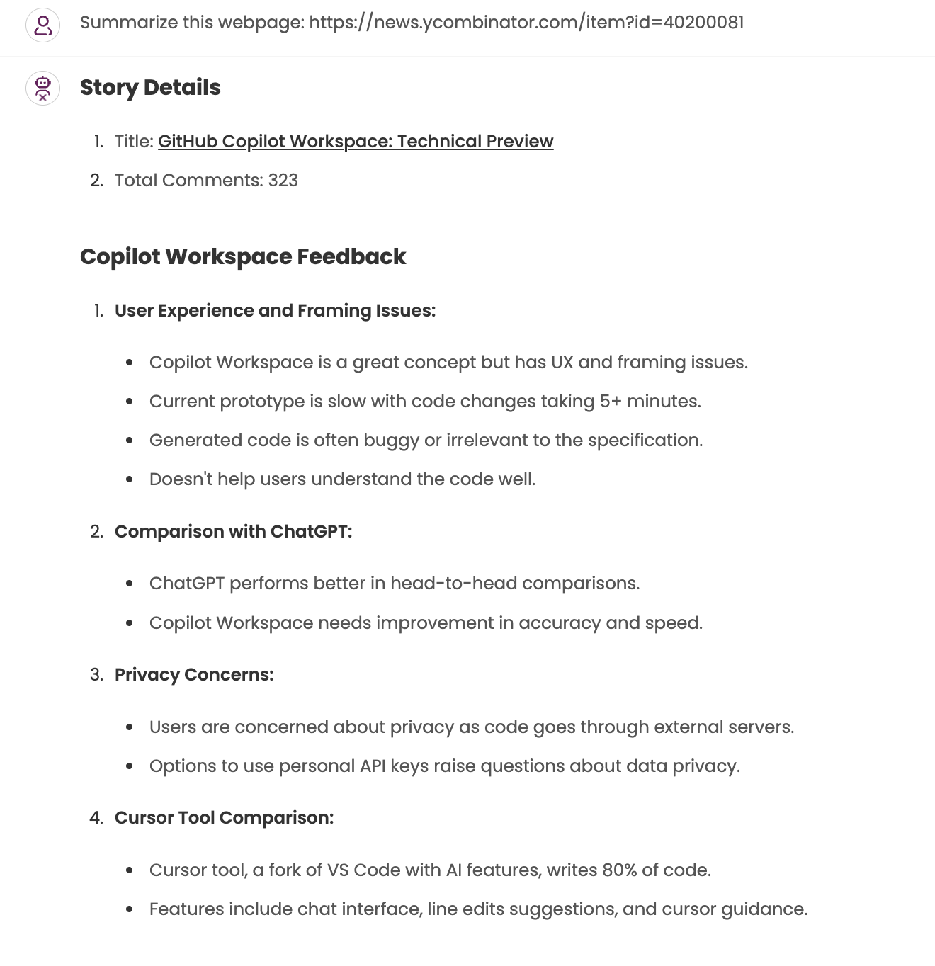For example, the thread on GitHub Copilot Workspace: Technical Preview which has 323 comments my tool generated following summary.